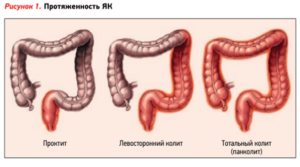 Распространение воспалительных изменений коррелирует от локального (только прямая кишка) до полного поражения всех отделов толстого кишечника. Редко при данном заболевании вовлекается конечный отдел тонкого кишечника, и также редко вовлекаются более глубокие слои, а не только слизистая.